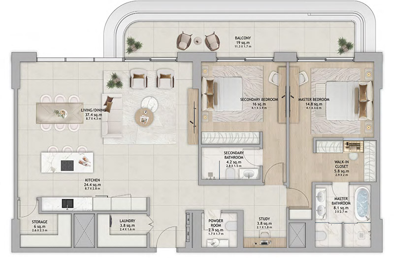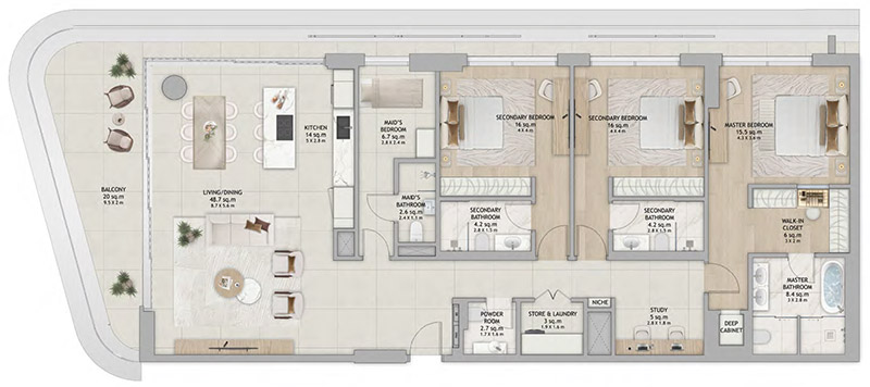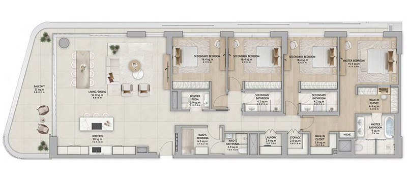 Fahid Island offers a selection of thoughtfully planned layouts with open living spaces, generous balconies, and refined finishes designed for modern coastal living.
